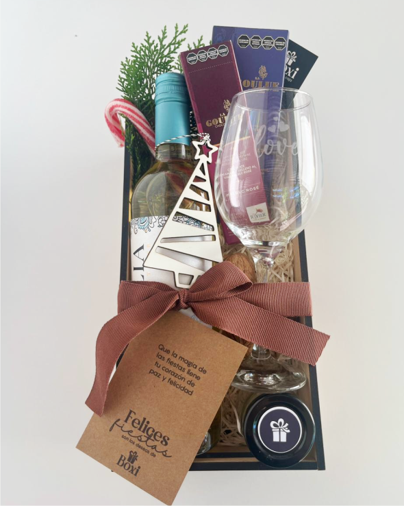 Además, deleita con el detalle exclusivo: la tableta de chocolate rellena con vino, una tableta premium, almendras y nueces. Y lo mejor: la copa de vidrio, grabada con tu logo o mensaje.
