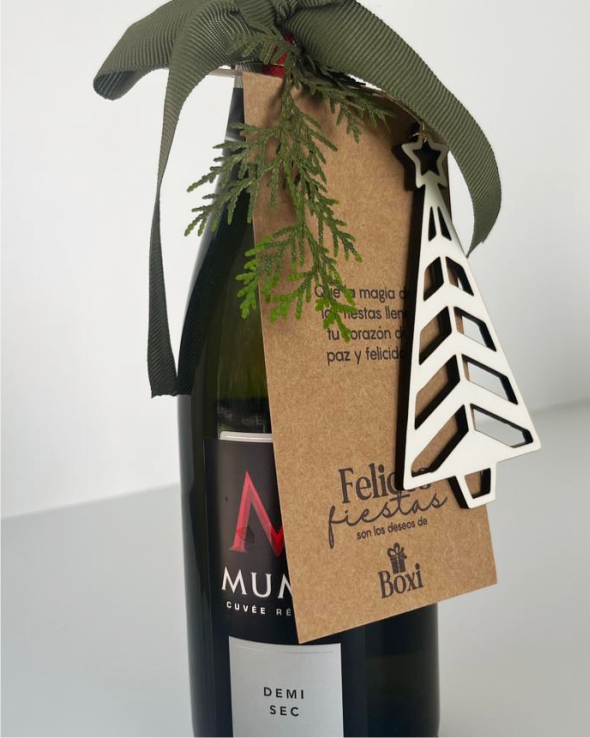 Cada botella viene vestida con nuestra decoración artesanal de Fiestas y la tarjeta personalizable con el logo de tu empresa.
