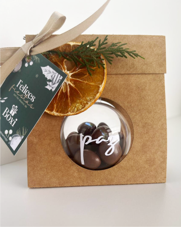 Este pack contiene una esfera con maní con chocolate y los mejores deseos (Amor, Paz, Unión).